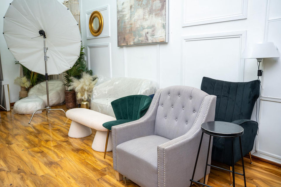Versatile, fully equipped creative studio designed for portrait, maternity, fashion, branding, and content creation. The space is styled for flexibility, allowing multiple looks to be achieved within a single session.